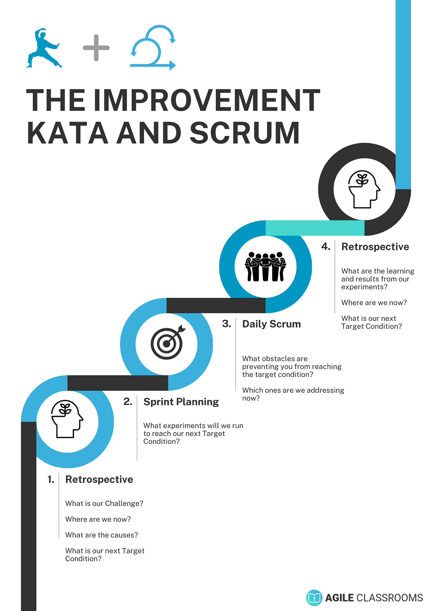 Sara devised a strategy to integrate the Improvement Kata and the Improvement Kata Canvas (download it free!) into the Scrum framework. This is what she mapped out: