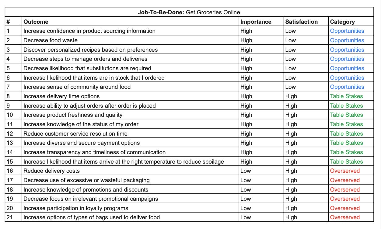 Table Stakes (High Importance/High Satisfaction): These outcomes are essential yet adequately addressed by current market offerings. They're the must-haves for staying in the game, not necessarily winning it. While they won't attract new customers on their own, neglecting them could drive your customers into the arms of competitors and prevent them from using your product.