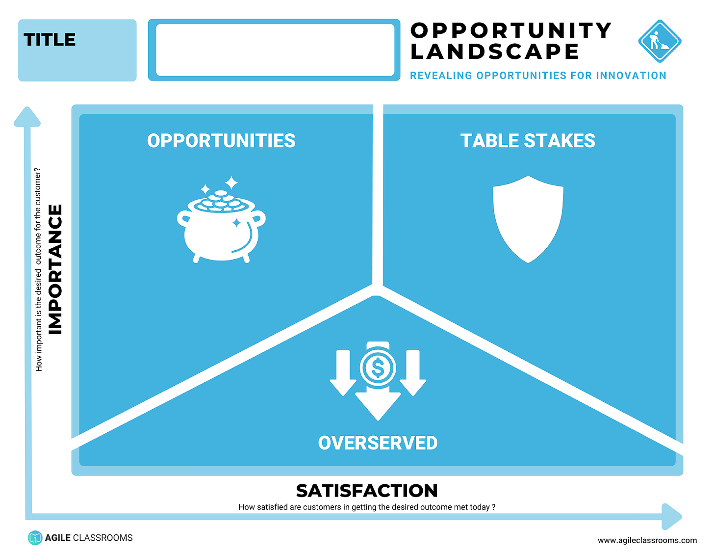 The Opportunity Landscape is like a map showing us where customer needs are—some are thirsty deserts (Opportunities), others well-watered plains (Table Stakes), and some even flooded areas (Overserved).